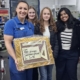 Drei Schülerinnen des Technikkurses TC 9 überreichten gemeinsam mit ihrem Lehrer Klaus Arens und Schulleiter Marcus Risthaus ein Zeichenbrett aus Schokolade als nachträgliches Geschenk zum 100-jährigen Firmenjubiläum.