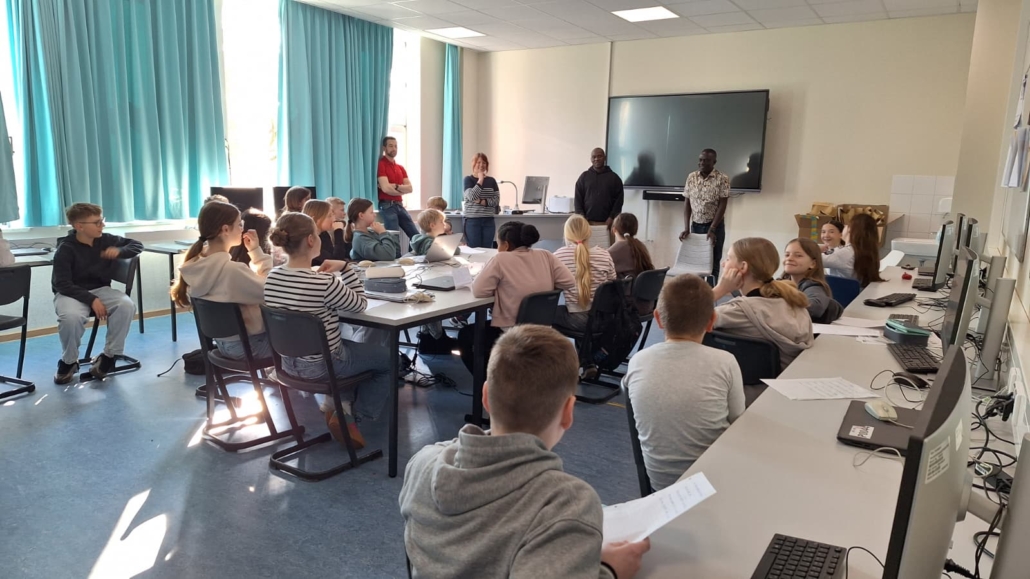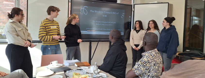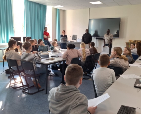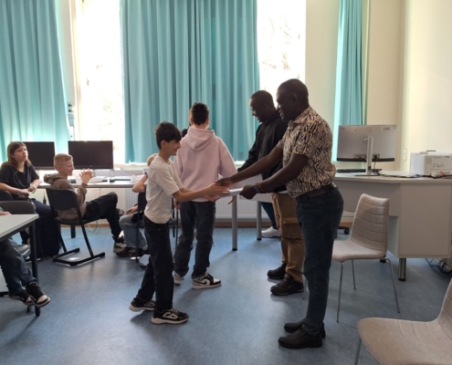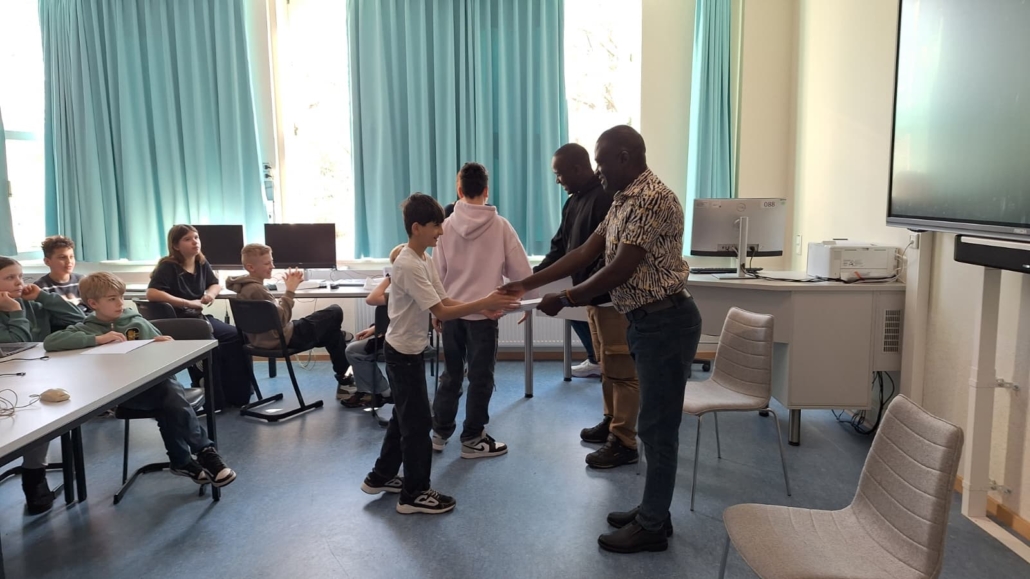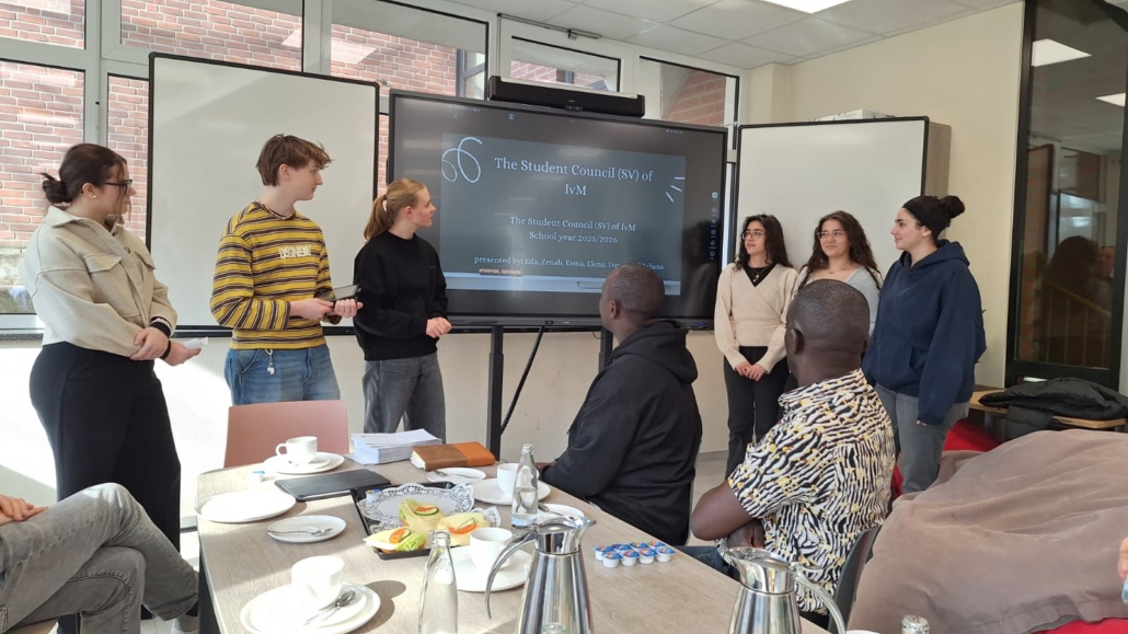 Besonderen Besuch durfte die IvM in diesen Tagen begrüßen: Die Schulleiter Steven und William aus Uganda waren zu Gast an unserer Schule. Nach dem für die Ewaldi Community School organisierten Sponsorenlauf im Jahr 2024 wollten sie sich nun persönlich ein Bild von unserer Schule machen. Nach einem kurzen Kennenlernen übernahm die Schülervertretung (SV) die Führung durch die Schule und zeigte den Gästen, was das Lernen an der IvM besonders macht. Eine Station war der Englischunterricht der Klasse 6b. Die Schülerinnen und Schüler hatten zahlreiche Fragen auf Englisch vorbereitet, die Steven und William geduldig beantworteten. Zum Abschluss der Stunde überreichten sie Briefe für ihre Briefpartner in Uganda, die im Rahmen der Schulpartnerschaft bereits seit mehreren Jahren regelmäßig ausgetauscht werden. Im PUEK-Unterricht erhielten die Gäste Einblicke in das Alpenprojekt. Hier beschäftigen sich die Schülerinnen und Schüler unter anderem mit Themen wie Mountainbiking in den Alpen oder den Veränderungen der Landschaft durch den Tourismus. Der Rundgang führte außerdem zu Herrn Risthaus sowie in den Technikraum, wo Einblicke in den Technikunterricht und die entstehenden Gesellenstücke der Jahrgangsstufe 10 möglich waren. Auch im Lehrerzimmer kam es zu einem angeregten Austausch mit vielen Lehrerinnen und Lehrern. Den Abschluss des Besuchs bildete eine Präsentation der SV, die ihre Arbeit vorstellte und die wichtige Rolle der Schülervertretung für das Schulleben erläuterte.