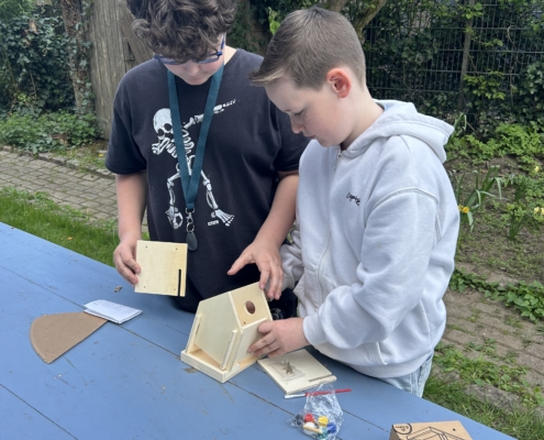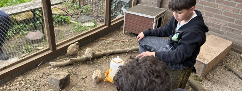Neun Wachteln bewohnen ab sofort die Voliere des Schulgartens und werden von den den Schülerinnen und Schülern der Garten-AG betreut. Dort lernen sie, die Wachteln zu versorgen, ohne sie zu erschrecken, denn Wachteln sind Fluchttiere. Die Namensgebung gestaltet sich etwas schwierig, denn die Wachteln sind (noch) schwer zu unterscheiden.